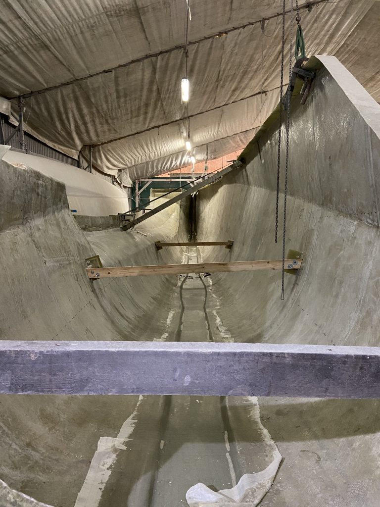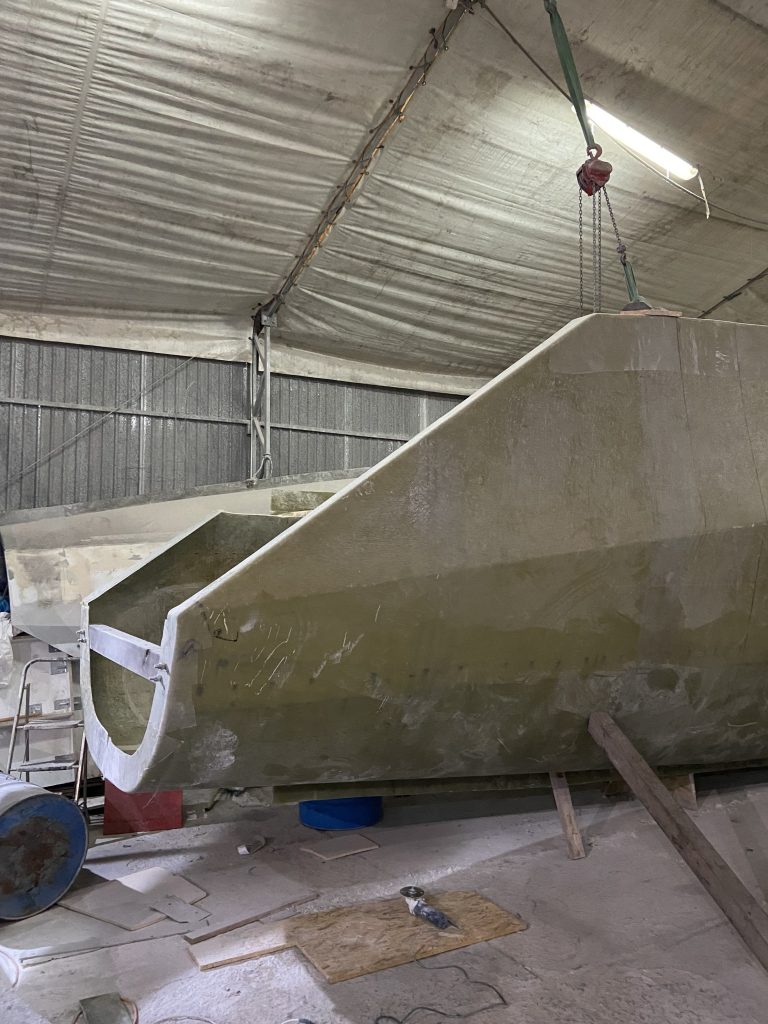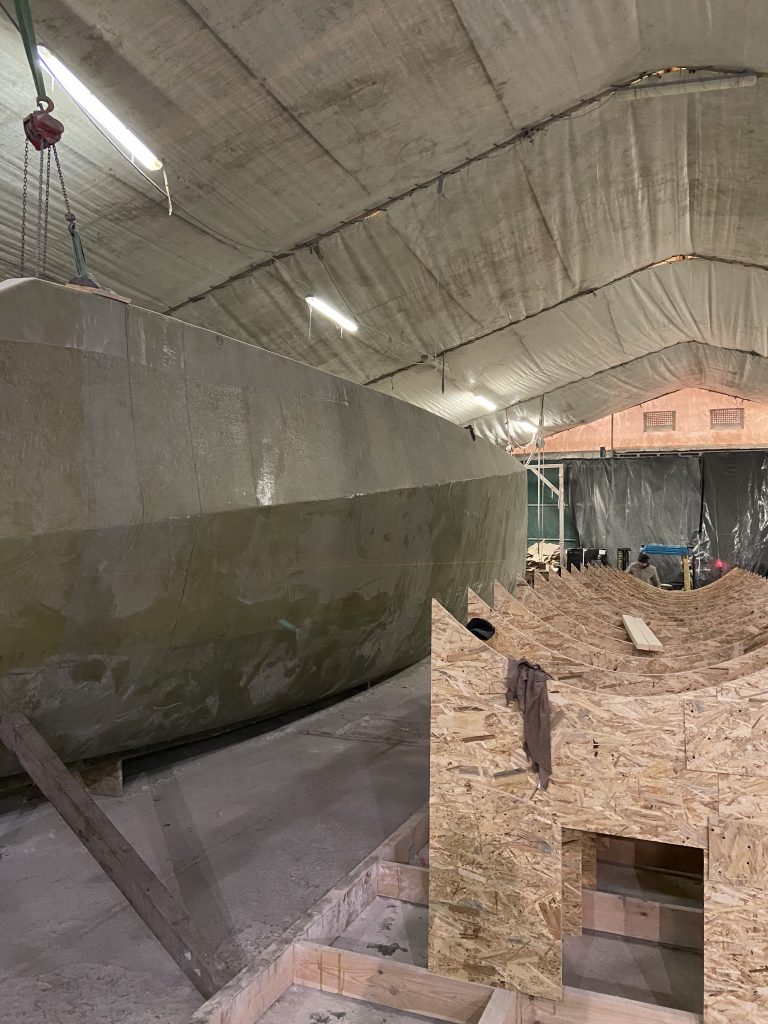 The two individual hulls detached from the negative moulds in the shipyard hall in Szczecin/Poland.